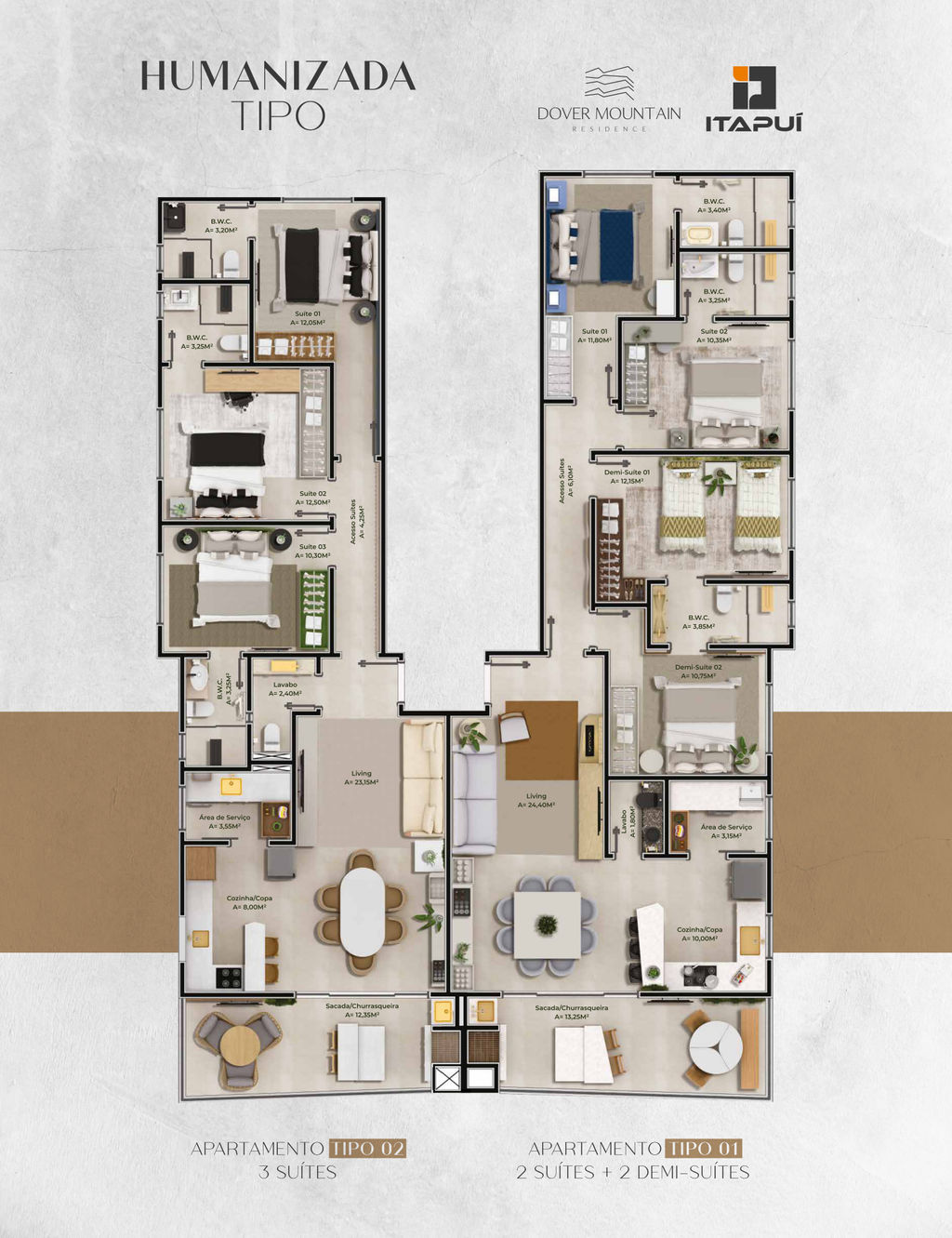Tipo 1: 2 suítes + 2 Demi-suítes – 130 m² privativos