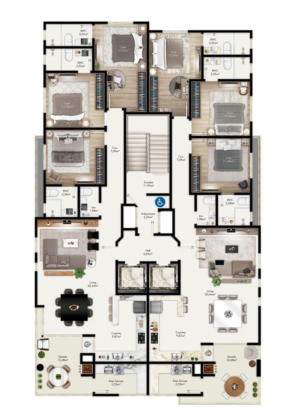 Áreas privativas de 125m² e 126m²