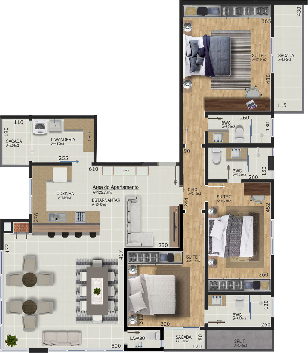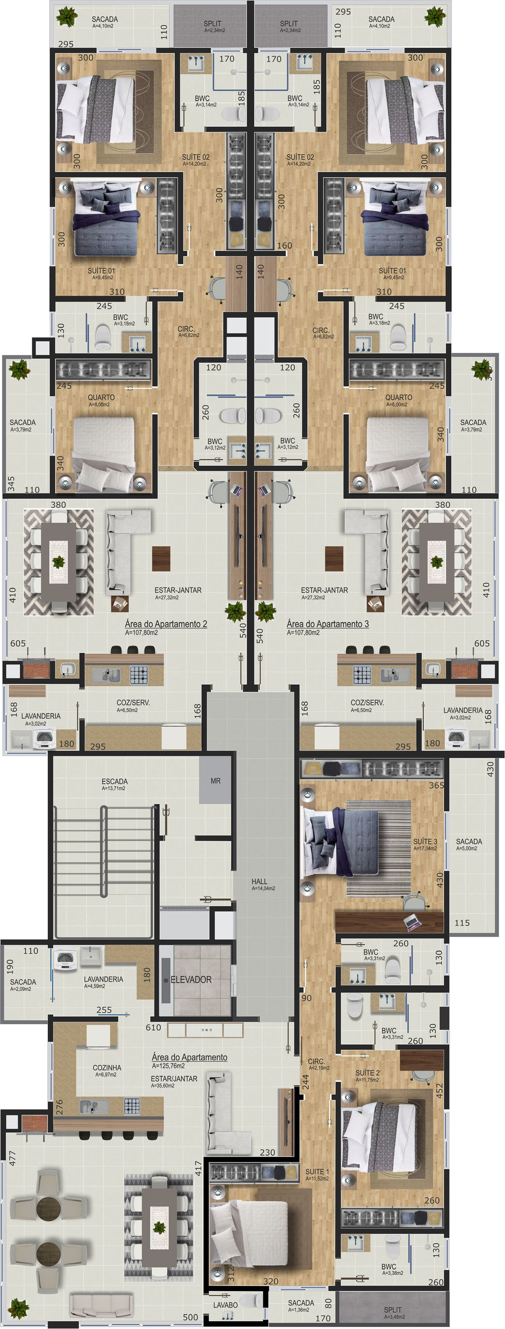 7 Apartamentos tipo 1 com 126m² privativos e 3 suítes