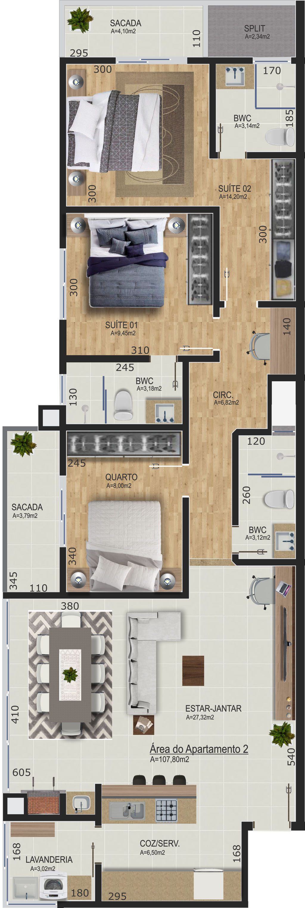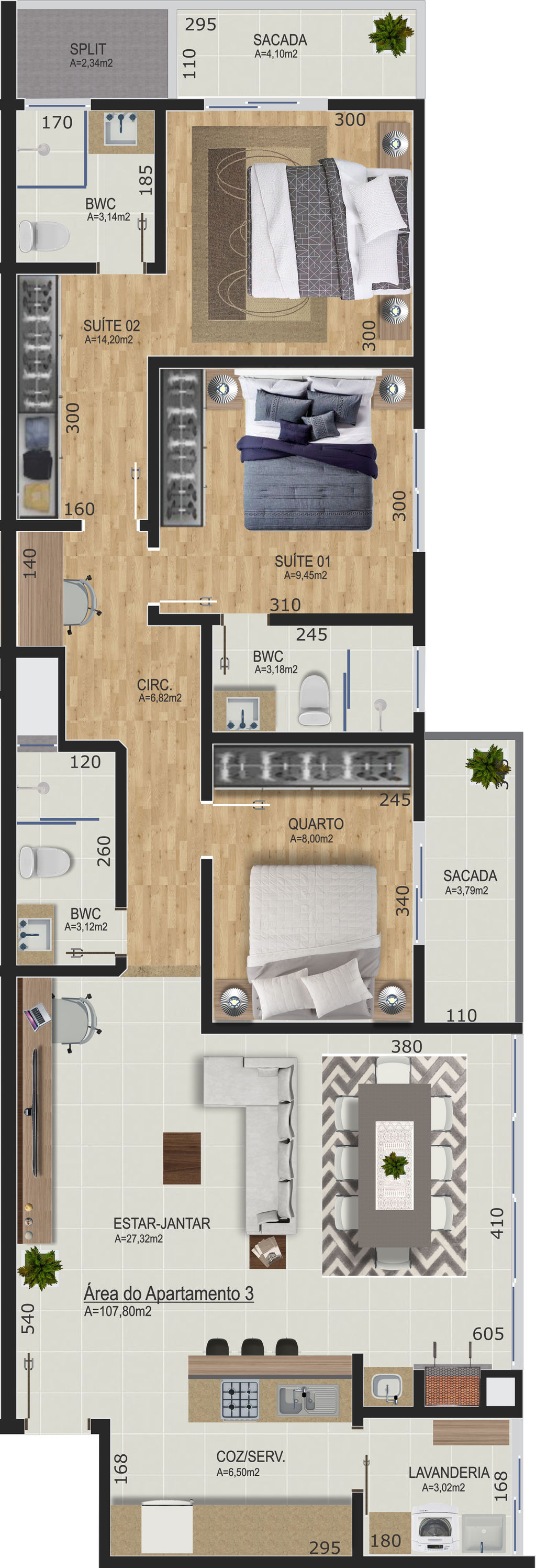 10 Aptos. tipo 2 e 3 com 108m² priv. 2 suítes e 1 dormitório